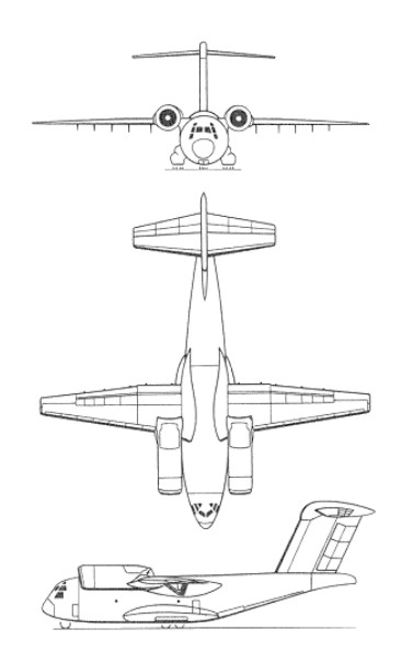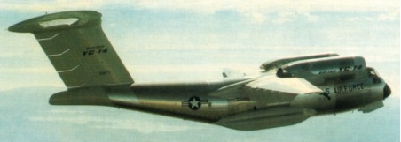 The Boeing YC 14 prototype (72-1873) for competitive evaluation against the McDonnell Douglas YC-15 was flown for the first time on 9 August 1976. Maximum payload was 150 troops or 36,742kg of freight in conventional operations, while for STOL operations from an airfield of less than 572m the payload was still a useful 12,247kg.
