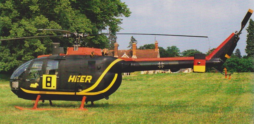 BO 105 M (VBH): Liaison and light observation helicopter for the Federal German Army, with strengthened transmission gearing, reinforced rotor components, a tail rotor with improved thrust and performance, a rupture-proof fuel system and a landing gear able to absorb higher energy levels. Production of 100 approved by the Federal government, to replace Alouette II. Deliveries completed in 1984.
