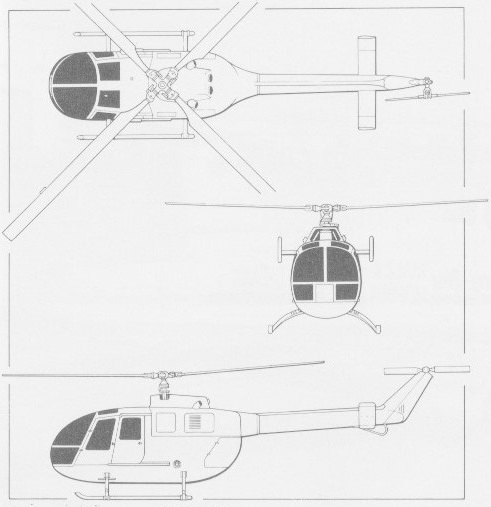 The Messerschmitt-Bolkow-Blohm GmbH Bölkow Bo.105 DBS-4 version has the 10-inch fuselage stretch at the rear of the cabin and the extra small rear side windows.