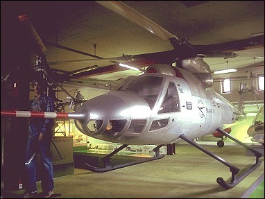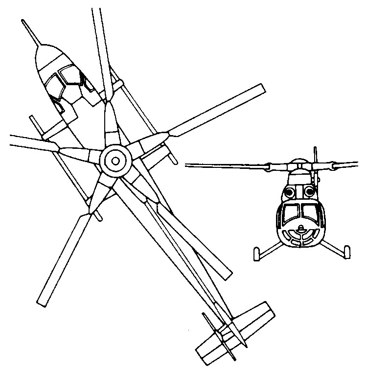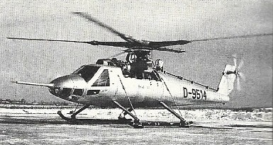 The Bolkow Bo.46, three experimental prototypes of which were built for the German Ministry of Defense, served as a flying test-bed for the Derschmidt semi-rigid rotor. The first model, built jointly with SIAT, began test flights in January 1964. The Derschmidt rotor underwent a long series of wind tunnel tests, for each blade had a hinge about half-way along its radius, enabling the outer section of the blade to rotate 40° backwards or forwards in relation to the inner section connected to the hub. This enabled the movement of the advancing blade to be “delayed,” thereby considerably reducing the tip speed. Conversely, by “accelerating” the movement of the outer portions, quite high rotational speeds could be achieved. However the complexity of this system prevented the Bo.46 from passing the experimental stage.