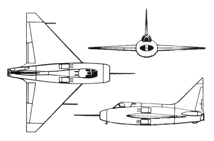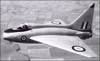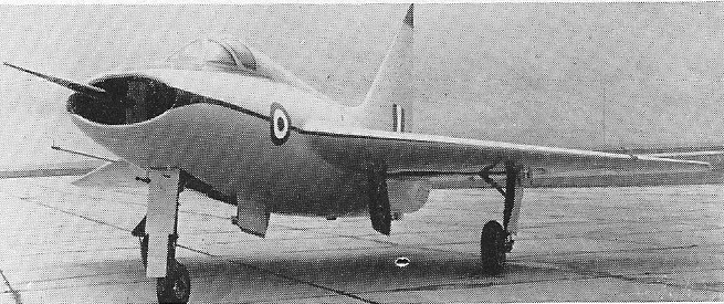The only example, VT935, first flew on October 6, 1950, and was powered by a Rolls Royce Nene turbojet of 5,100 lb st. It featured a 45 degree delta wing with detachable tips to enable comparative tests of blunt and pointed wings to be made. The fin tip was also removeable. Data recording equipment, including a fin mounted camera, was fitted. It originally flew in natural metal finish and was supplemented from August 1952 by the P.120.