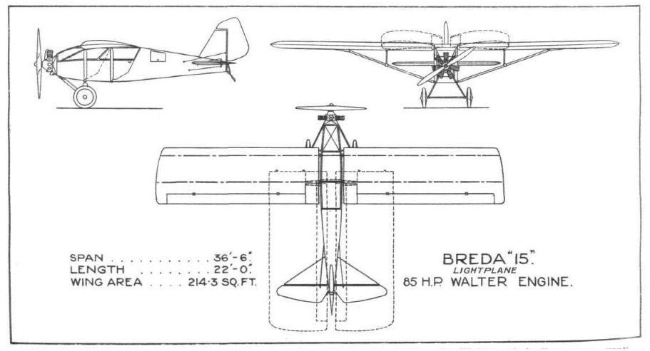 The Italian Air Ministry put forward a programme for the encouragement of Civil Aviation, with the result that the ” light ‘plane “, or medium-powered touring aeroplane, as it is classed in Italy, received a large share of attention from aircraft designers. Several were produced by various firms in Italy, among them the Breda Co., with the Breda 15.