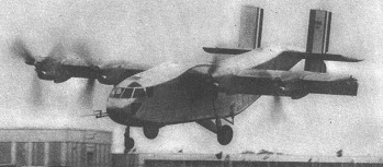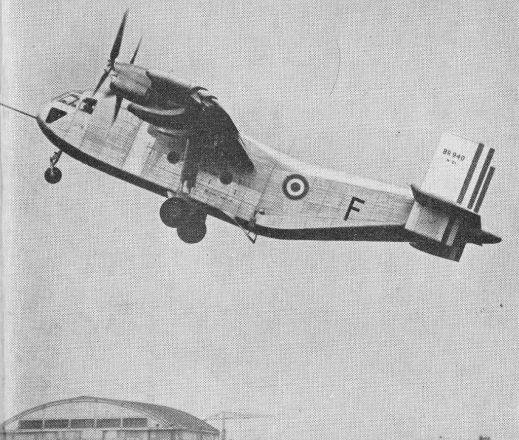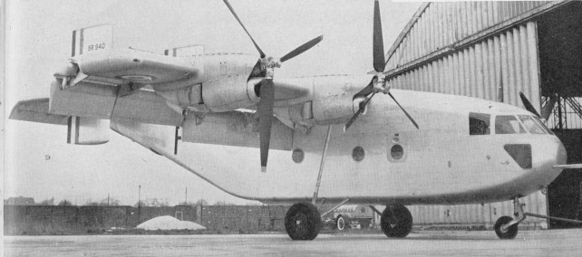 The experimental Bregeut Br.940 first flew on 21 May 1958. For STOL operations, it is fitted with camber-changing slotted flaps, and large diameter, slow turning propellers driven by Turbomeca Turmo II turboprops.