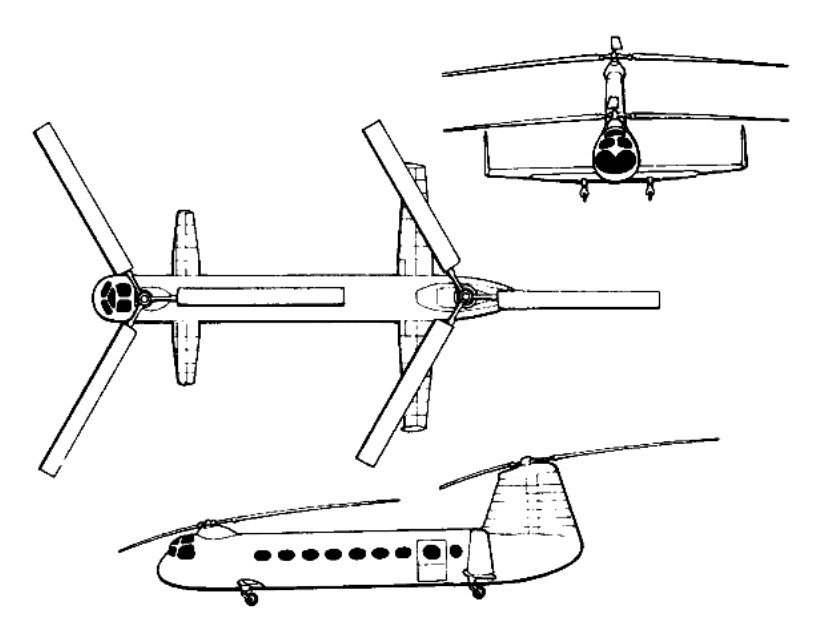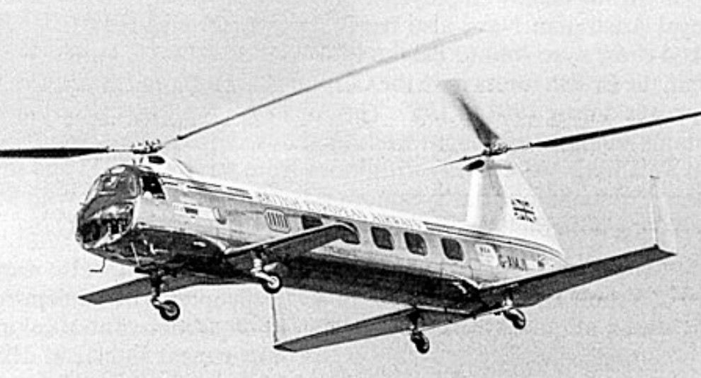 Ground tests started in 1951. It had two three-blade counter-rotating rotors, but it could fly on one Alvis Leonides 73 engine and the centre of gravity could be displaced. The two rotors were synchronized by a shaft in conjunction with a gearbox. In the event of a breakdown the shaft could transmit power from the working engine. The rear rotor was carried on a pylon which was part of the vertical fin structure. Two tailplanes were set at a sharp angle to improve longitudinal and lateral stability.