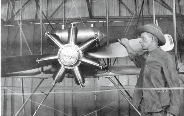 Allen Betteridge is seen here examining the 50-hp Gnome engine of a Bristol Boxkite at CFS, Point Cook, Australia, during his initial instruction as an air mechanic.