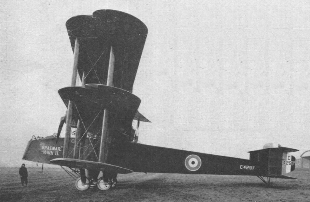 An unsuccessful contender for a 1917 large bomber requirement, the four engined triplane Bristol Braemar which did not go into production. The Braemar formed the basis of the Pullman, an equally unwanted airliner with a large cabin and enclosed cockpit. The Pullman’s crew distrusted this feature and took to carrying axes with which to hack their way out in an emergency.
