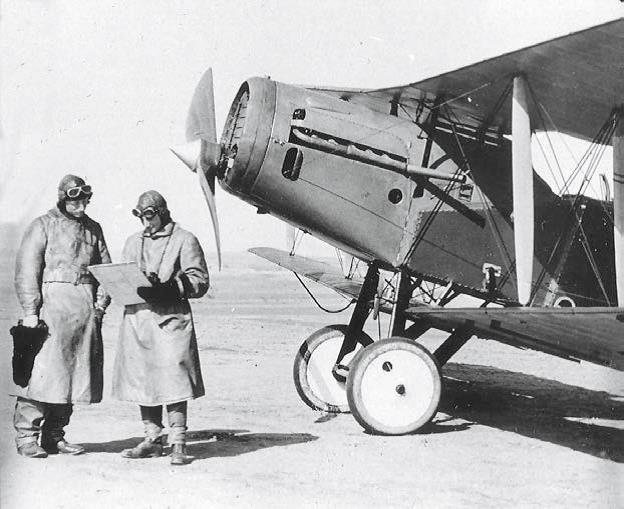 Capt Ross Smith (left) and Lt ‘Pard’ Mustard discuss their patrol in front of a 1 AFC Bristol Fighter.