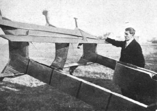 Parallel with the body 2, and having the same breath as this body, is an immovable flat 4, to the rear of which is hinged the horizontal rudder 5 for altitude steering.
