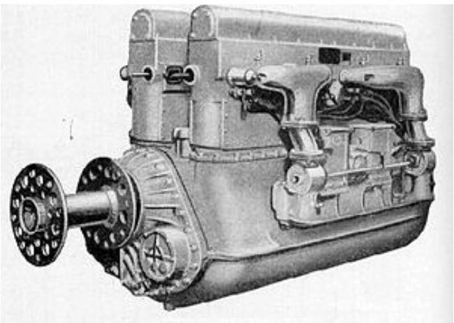 The Bugatti U-16 was a 16-cylinder water-cooled double-8 vertical in-line “U engine”. The U-16 engine was designed by Ettore Bugatti in 1915-1916 to use as many features of a previous Bugatti 8-cylinder in-line engine as possible. Two eight-cylinder banks were mounted vertically side by side on a common cast aluminium crankcase, each bank driving its own crankshaft. The two crankshafts were geared to and drove a single common airscrew shaft. The shaft was bored to accept a 37-mm gun barrel, and a clear passage was provided through the crankcase in line with the shaft boring for the same purpose. Each eight-cylinder bank was made up of two cast iron four-cylinder blocks; the crankshafts were each made up of two standard four-cylinder crankshafts joined end to end by a fine taper cone joint. To reduce overall length, these crankshafts were undercut.
