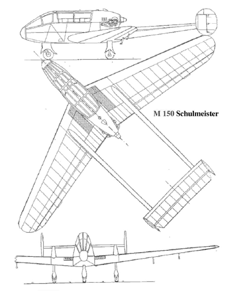 Developed from the A-15 (WN-16) aircraft, designed by the former Wiener-Neustadt company, the M-150 Schulmeister (Schoolmaster) is a two-seat, low-wing type, powered by a 65 hp Continental C90 incorporating a pusher propeller.