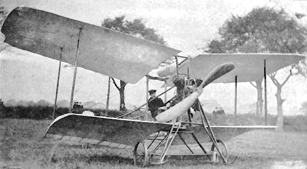 In the UK in 1911 Mr. Carter was out on the new machine and with the engine running fairly well, the machine made a few hops. The machine is of the biplane type of very short span, with the upper planes of slightly greater span than the lower ones. There is no elevator in front, but that position is occupied by the engine and propeller. The engine is an 8-cyl. made by the Nonpareil Motor Fitting Co. at Birmingham. At present it gives about 60-hp, but when properly tuned up it is expected to reach about 80-hp Mr.Carter succeeded in getting the biplane off the ground for short distances.