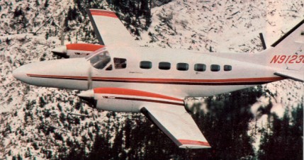The Cessna 441 wings are of “failsafe” construction, meaning there is no life limit requiring either fail safe design or established fatigue life limits. The useful load of the 441 is 48 percent of its gross weight. The cabin is pressurized to 6.3 psi for a 10,000 foot cabin at 33,000 feet. The 441 will climb to 33,000 in 22 minutes. The wing is of bonded construction, with 30 percent chord Fowler type flaps utilized to lower the landing speed. Maximum cruise is 277 knots. VFR range with 10 and baggage will be 1,150 nm; it will be 1,830 nm with five and baggage. The airplane exceeded every performance standard set for it before the certification program began, including a 10 knot increase in maximum cruising speed at 33,000 feet, to 287 knots.