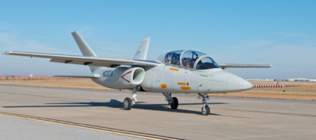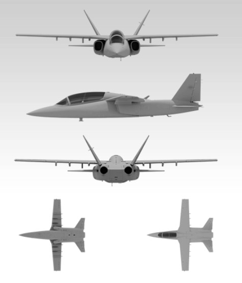 The two-seat jet is powered by twin-turbo fan engines and will be able to carry 3,000 pounds of internal payload. The all composite airframe will have an initial service life of 20,000 hours.