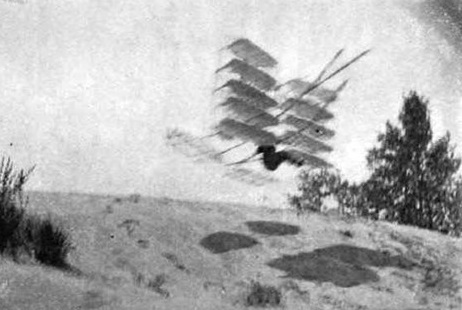 The improved arrangement as seen from one side in flight. It will be noticed that no less than five of the six pairs of wings have been superimposed at the front, and trussed together. That the operator is within and under them, and that a single pair of wings remains at the rear to serve as a tail. This tail was flexible and vibrated up all down in flight when the angle of incidence varied in consequence of the back and forth movements of the pivoted front wings.