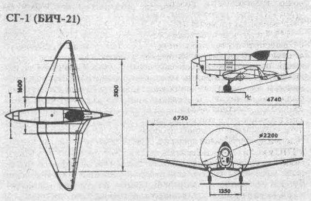 During the design of the new SG-1 racing aircraft (SCR-21), designer Boris Ivanovich Cheranovsky applied a trapezoidal wing shape but with a broken leading edge. The center-wing was straight and the outer had a swept 25º. By the front view, the wing was a “reverse gull”, and tailless.