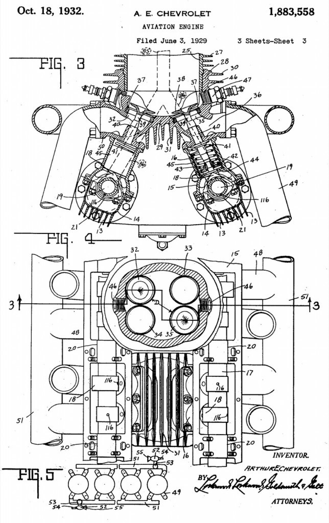 Around 1925 Louis Chevrolet started taking a deeper interest in aviation, attending air shows in and around the Indianapolis area. In 1926 he entered into negotiations with a group of Ohio businessmen who were looking to develop a new airplane engine. In the spring of 1927, the Chevrolet brothers completed their first aviation engine, an air-cooled, single-overhead-cam, 4-cylinder engine. This engine was installed in a biplane built by the Moundsville Aircraft Corp of West Virginia. There are photos of Charles Lindbergh inspecting the engine in that airplane in the summer of 1927. On the plane’s maiden flight, it was forced to make an emergency landing because of engine trouble (thankfully nobody was hurt). The Chevrolet brothers went back to the drawing board, and news of their venture quickly disappeared from the public eye. In late 1927 or early 1928 the brothers had a heated argument, split up, and did not talk to each other for several years to follow. Given the failure of the first aero engine, and the events that took place in early 1928, it would appear that the argument stemmed from the design of their airplane engine.