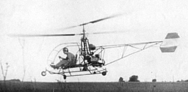 The first (1961) helicopter designed and built by Augusto Cicare is a single-seat single-engine with two counter-rotating coaxial rotors. Each rotor has two blades. The cyclic control varies the inclination of the rotors axis. The airframe is made of steel tubes. The four stroke, four opposite cylinders engine was also designed and built by Augusto.