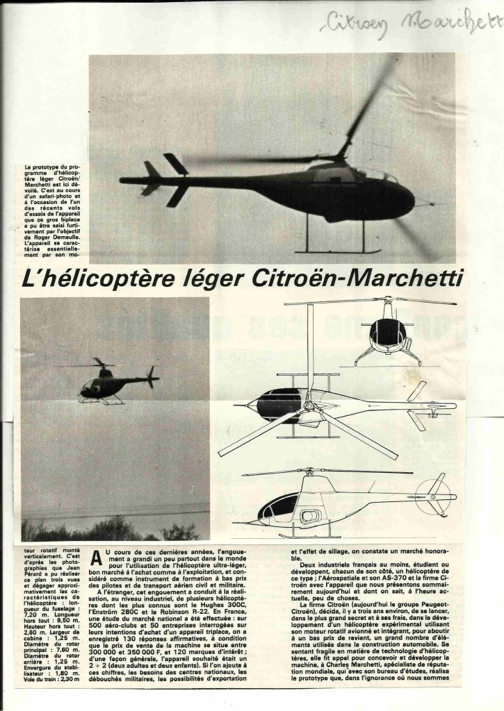 French helicopter engineer Charles Marcetti was commissioned to design and build a small helicopter, which would be powered by a Comotor 624 twin-rotor (170hp) engine. A development of the engine used in the prototype GS Birotor. Charles Marchetti had designed the successful helicopter Alouette.