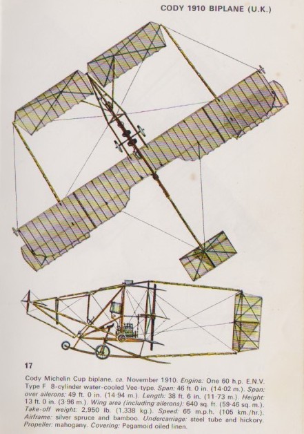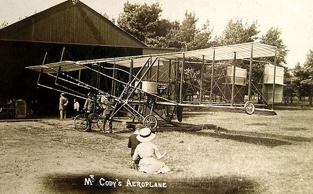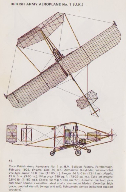 It was in this aircraft that Cody made his first hops in May, 1908, on Laffan’s Plain. On October 5 or 16th 1908 he made the first official flight in a piloted aeroplane in Great Britain a measured distance of 496 yards at a height of 50-60 ft over Laffan’s Plain (it lasted 37 seconds), Farnborough, and this was the first powered aeroplane flight in Britain; but Cody was American at the time, and did not take out naturalisation papers until 1909.