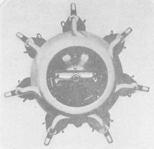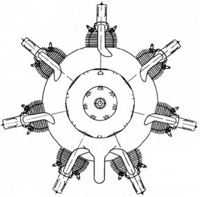 The crankcase is built of two sections united by seven through bolts, as well as by the cylinder flanges. The gear case cover carries the magneto and tachometer gears and oil pumps. The diffuser cover supports the magnetos and carburettor. A ball thrust bearing is carried in the front section. The cam is ball bearing mounted.