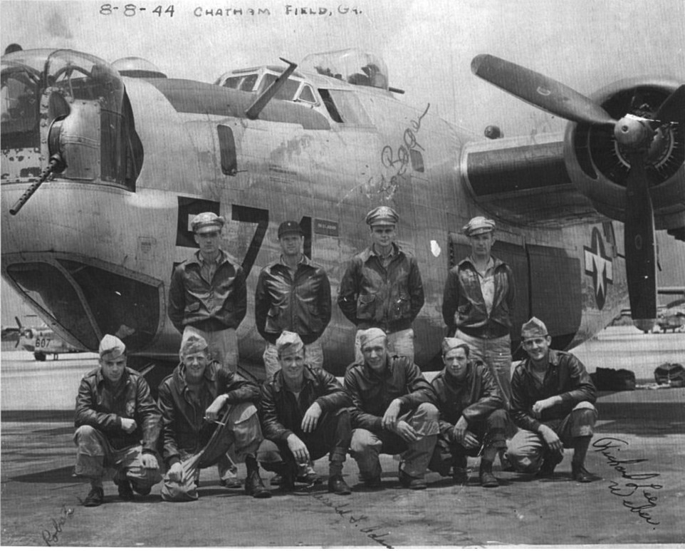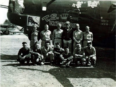 Air crew and ground crew members with 460th BG/761st BS aircraft No. 42-52381 “T. S. Express”. Back, L-R: Jack Reid, Co-pilot; Harold Teitelbaum, Navigator; Chauncey B. “Buck” Long, Engineer/Gunner; William H. Bell, Pilot; Ray Huntsinger, Engineer/Gunner; A. E. W. Cicewoen (name to be verified), Tailgunner. Front, L-R: Unidentified ground crew member; Unidentified ground crew member; Unidentified ground crew member; Joseph William Slate, Engine Mechanic, ground crew member; Unidentified ground crew member; Ted Elias, Radio Operator/Nose Gunner; Peter Medalik, Gunner.
