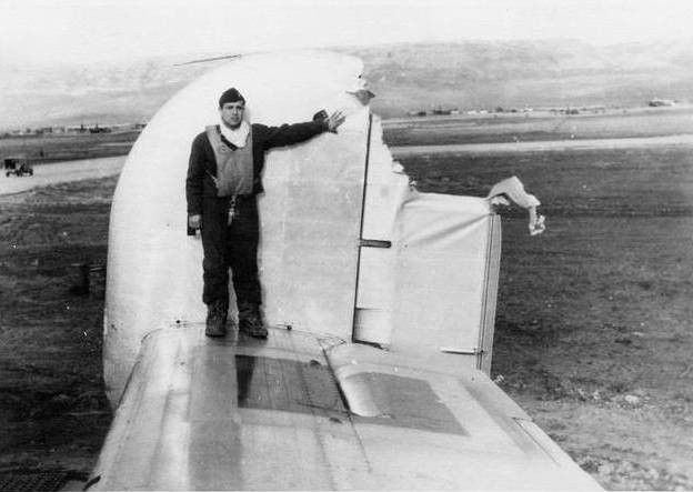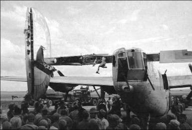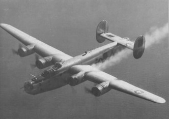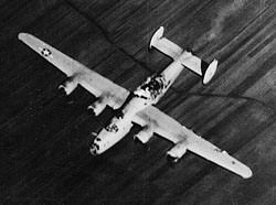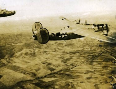 460th BG/760th BS B-24 with tail damage from a September 22, 1944 mission to the Oberweisenfeld BMW factory near Munich