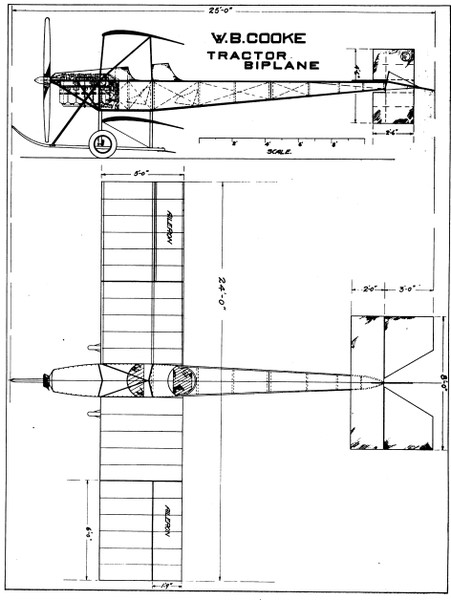 Cooke designed the aircraft for a 75 mph (121 km/h) top speed. For the time it was designed, it was a very modern aircraft, incorporating features that wouldn’t become commonplace on aircraft until towards the end of the Great War. The layout of the aircraft itself, a tandem two seat biplane with a tractor motor, was very unusual in 1912. Most of the aircraft being built and flying in North America at the time being some variation of a Curtiss type pusher biplane where the pilot and passengers would sit exposed in front of the leading edge of the lower wing.