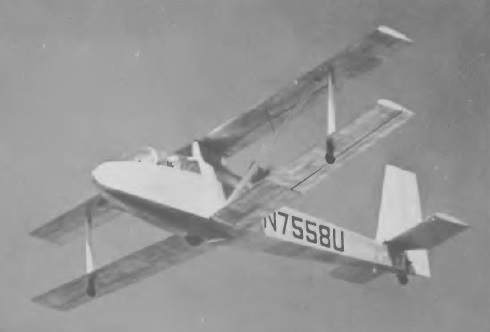 The 65-1 was designed and built by R. S Corcoran, an experienced sailplane pilot who was also the president of a company bearing his name which manufactured centrifugal pumps and other products. The 65-1 single-seater first flew in prototype form in October 1965, the powerplants being two 8hp West Bend 820 single-cylinder go-kart engines mounted on small booms extending from aft of the cockpit, and driving two-blade fixed-pitch pusher propellers. Construction is all-metal, the single-spar wings having aluminium skinning and unbalanced piano-hinged ailerons; the upper wing has flaps along 60% of its span which can be lowered to four positions, the maximum deflection being 35°. There is a single interplane strut and bracing strut on each side. The slab-sided fuselage is built up from aluminium extrusions and is also covered with aluminium; the landing gear consists of a monowheel mounted in an under-fuselage fairing, a steerable tailwheel and two small outrigger balancing wheels under the lower wings below the interplane struts – these are actually Sears ballbearing lawnmower wheels. The pilot sits under a single-framed cockpit canopy that hinges to port for entry and exit. The prototype 65-1 had a wing area of 100sq ft and was followed by a second prototype with a wing area increased to 180sq ft and two engines mounted inboard in the fuselage and driving belt-driven propellers mounted on outriggers.