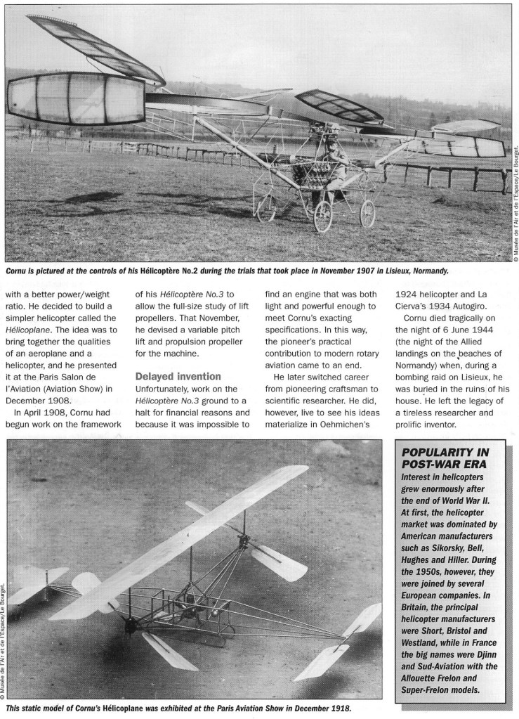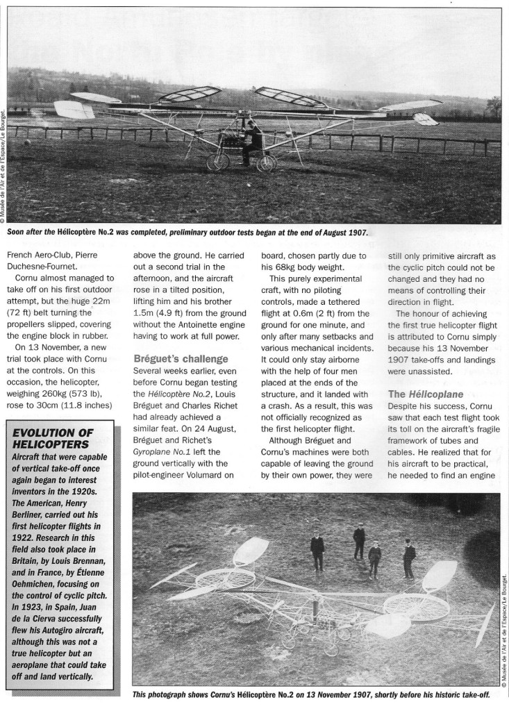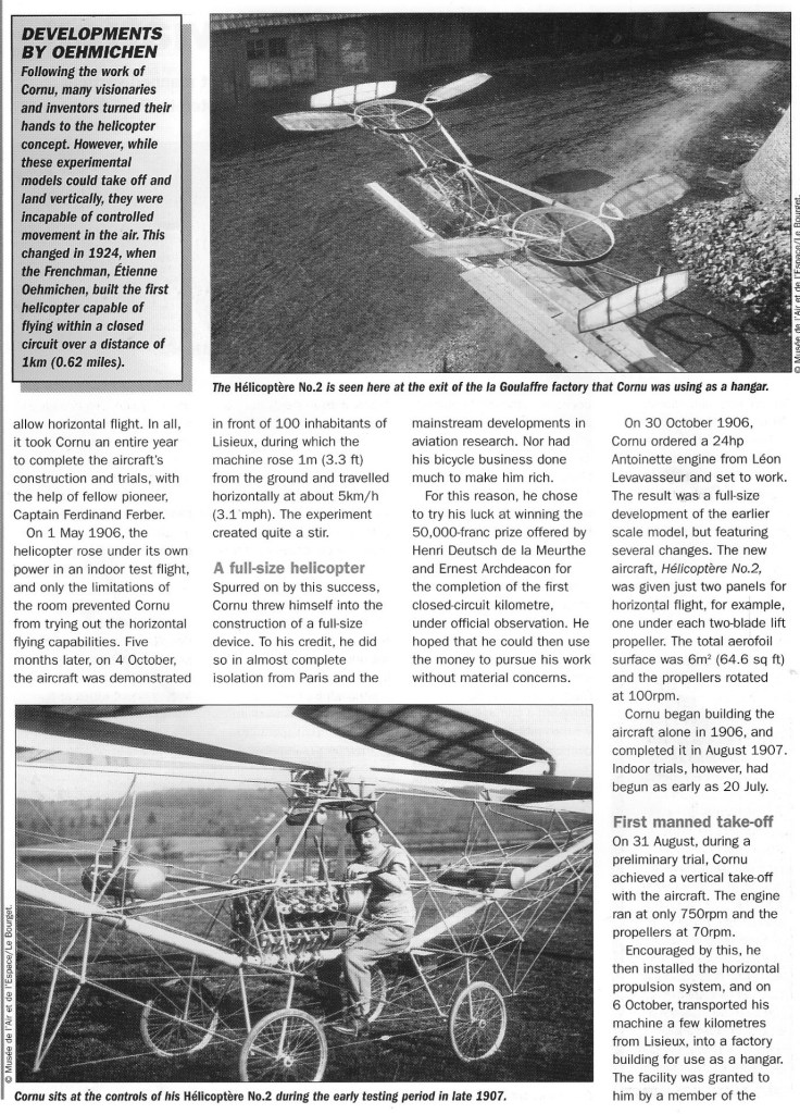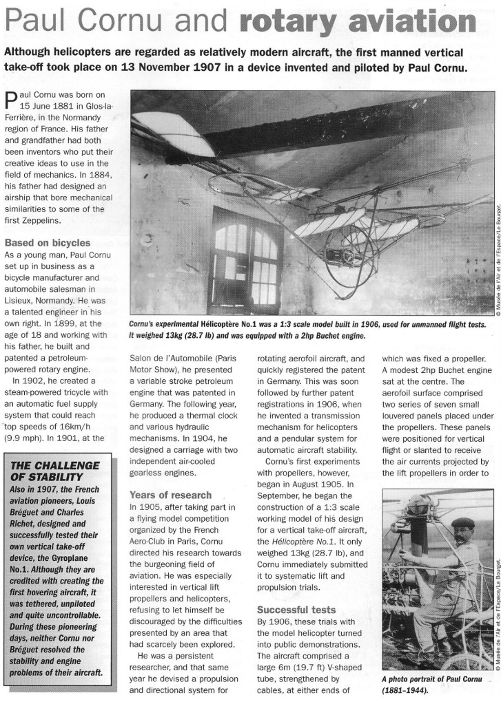 The first Paul Cornu helicopter was built in 1906 in Lisieux. The machine weighed 13.75 kg and its Buchet engine delivered a full 2 hp and drove two 2,25 m rotors. Horizontal propulsion was achieved by inclined surfaces that were placed in the downwash from the lifting propellers.