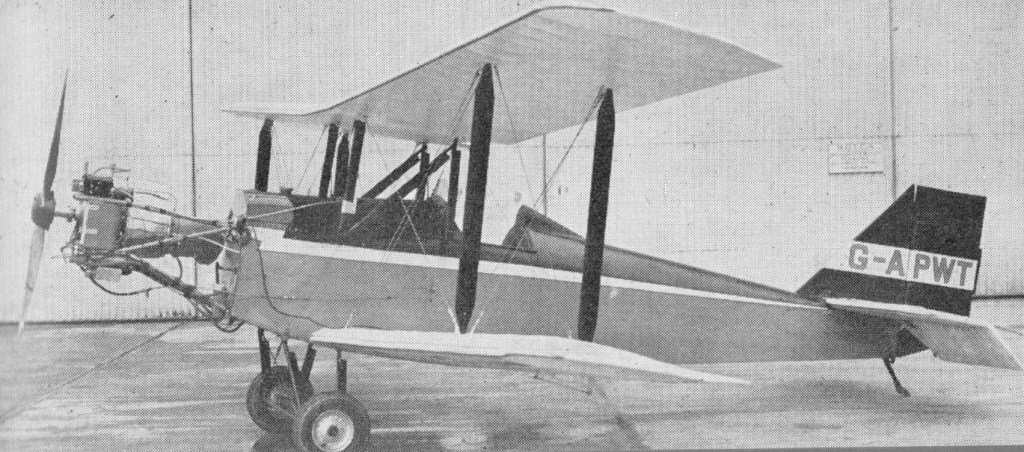 Several examples have been built by amateurs since then and a variety of engines fitted. These include the 37 h.p. lAP, 65 h.p. Mikron, 65 h.p. Continental and an experi¬mentally fitted Rover turbo-prop engine. The larger VW engine should also be suitable. The aircraft has recently been restressed to 6g at an A.U.W. of 900 lb. The fuselage is a conventional box structure, having spruce longerons and struts, and is plywood covered. The wings consist of four separate panels and a centre section, each having two solid spruce spars, built up girder ribs and fabric covering. Ailerons are fitted to the lower wings only. The empennage is a wooden structure, fabric covered. An alternative rounded rudder may be fitted. Longitudinal trim is obtained by an elevator trim tab. The undercarriage is made up of steel tube and incorporates rubber cord shock absorbers. A 12 Imp. gallon fuel tank is located behind the firewall.