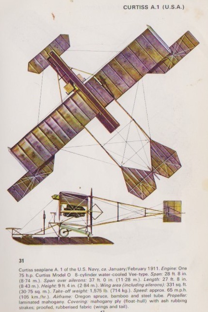 The A-1 was used in a variety of aerial “firsts”—first cross-country flight, 112 miles in 122 minutes; first (albeit unsuccessful) catapult launch (On 31 April 1912); first night landing on water without lights. It also set a world seaplane altitude record of 900′, and completed 285 flights.