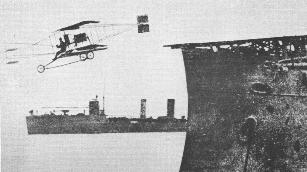 18 January 1911 Eugene Ely landed on the USS Pennsylvania, halted by sandbags attached to ropes across the flight deck, picked up by hooks under the aircraft’s landing gear.