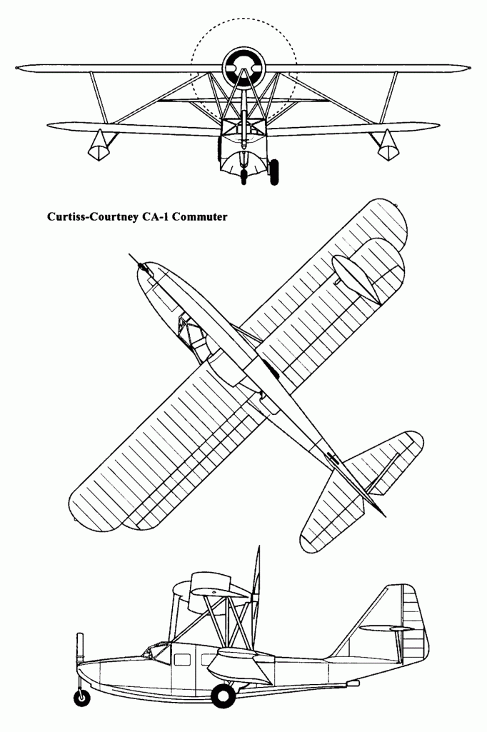 Designed by the British test pilot Frank Courtney, the Curtiss CA-1 (sometimes known as the Commuter or the Courtney Amphibian), was a five-seat amphibian. The CA-1 was powered by a 365 hp (272 kW) Wright 975E-1 radial, cowled and fitted into the leading edge of the top wing driving – through an extension shaft – a pusher propeller. When Wright told Courtney that this could not be done, the Briton went to a non-Curtiss-Wright mechanical workshop and successfully assembled his design.