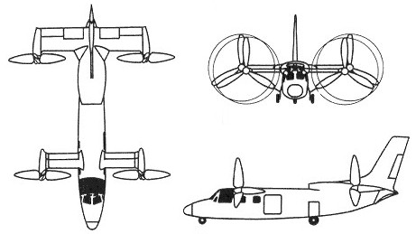 The X-19’s basic configuration was an all-metal, monocoque fuselage, with two shoulder-mounted tandem wings. A nacelle at each wing tip could rotate from pointing vertically for take off and landing to pointing horizontally for cruise. The wide, specially-designed propeller was mounted in front of each nacelle. Two turboshaft engines housed in the rear fuselage powered the four props. The fully hydraulic tricycle landing gear retracted completely into the fuselage. A large vertical tail was required because the props were located relatively close to the fuselage. Total height was just over 5m.