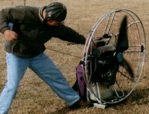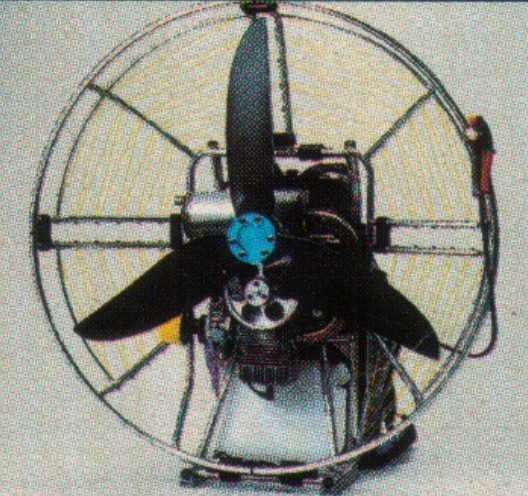 A paraglider power-pack with a duralamin frame, auto lock carabiners, and hand engine controls. The engine runs a 2:2.21 reduction unit providing 115 lb thrust. First flown in 1992.