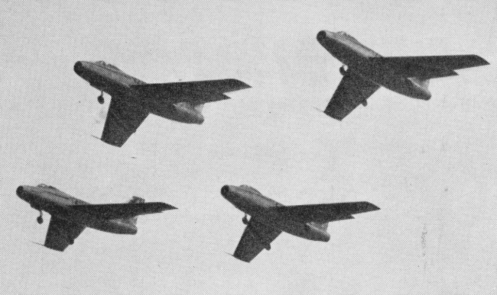 Having almost completed all Ouragan contracts for the Armde de PAir, for the Indian Air Force (where 71 are in service under the name Toofani), and against off -shore orders, Dassault were beginning to turn out Tay- and Atar-powered Mystere 2s in 1955. These were be followed by the RA.7R-powered Mystere 4B and the 4N. The first prototype 4N was being assembled; it looks much like a Sabre F-86D with two tandem seats and has a single-piece “all-flying” tailplane and full radar interception fire-control.