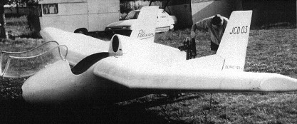The “Pélican” flying wing was designed by Jean-Claude Debreyer based on the AV-36. Unlike that machine, however, it is not designed for soaring but only for inexpensive powered flight. The designer’s goal was to produce a machine that was easy to build, ultra-light and low in cost, which explains the choice of the flying wing configuration, the low aspect ratio of the wing and the tandem landing gear. The prototype was built of wood with a few laminated parts; the wing section was the same as that of the AV-36 (Fauvel F4 17%). The two-stroke engine, mounted at the rear of the short fuselage, between the two fins, drives a two-bladed propeller directly. The Air Est Services, based in eastern France, offers a kit version, built of composite materials, named JCD-03. It can be equipped with a 12 hp Solo engine or a 24 hp Koenig which gives a considerable improvement over the original performance figures.