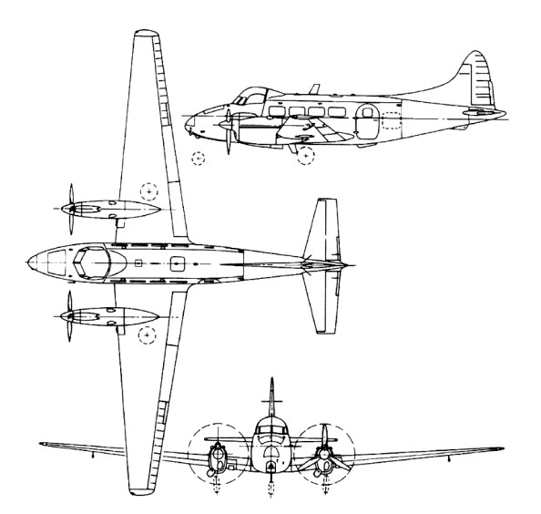 In 1944 R E Bishop and his team envisaged the DH104 as a successor to the Dtagon, Express and Rapide, and incorporated new construction techniques such as Redux bonding in the airframe and a tricycle undercarriage. A new low-wing monoplane which, with the exception of fabric-covered elevators and rudder, was of all-metal construction, and powered by two de Havilland Gipsy Queen engines, with constant-speed, fully-feathering, and reversible-pitch propellers. Standard accommodation as a transport was for 8 to 11 passengers.