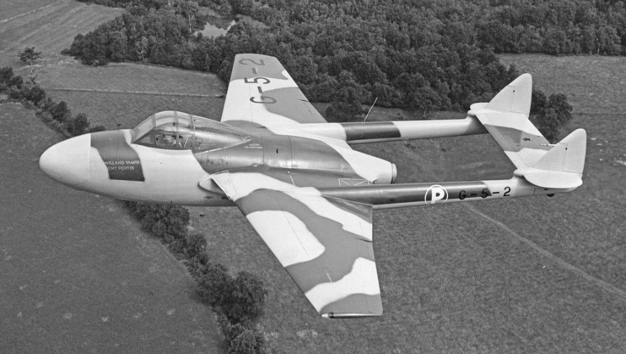 The first prototype DH Vampire NF10 (G-5-2) was flown for the first time at Hatfield on 28th August 1949 with test pilot Geoffrey Pike at the controls. Nine days later it made its public debut at the SBAC Show at Farnborough and just a month later Egypt became its first customer when it ordered 12 aircraft. This order was never fulfilled due to a UK Government enforce embargo due to the increasing hostilities between Egypt and Israel.