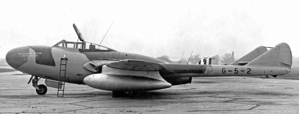 Although developed earlier than the Venom, the DH113 Vampire Night-Fighter (NF) had a later type number in the company sequence by the time it was produced. It was developed from the single-seat Vampire FB.5 as a private venture low-cost Night-Fighter for the export market. It featured lengthened and wider two-seat, side-by-side arrangement and a wooden fuselage nacelle with AI Mk.10 radar within a nose radome. A more powerful 3,350 lb Goblin 3 engine was fitted and first flight was from Hatfield on 28th August 1949 by Geoffrey Pike.