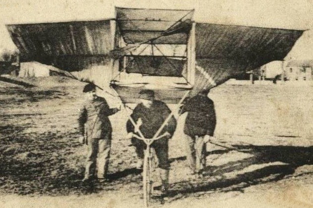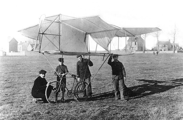 The flying bicycle of the Comte Gustave de Puiseux of Ouistreham (France) built in 1909. From the bicycle four tubes connected to the wing construction above, where in front a 1,1 meter propeller was mounted. This propeller was driven by the cycler via a rod construction on the wheel at the back. Total weight of the machine was 33 kg.