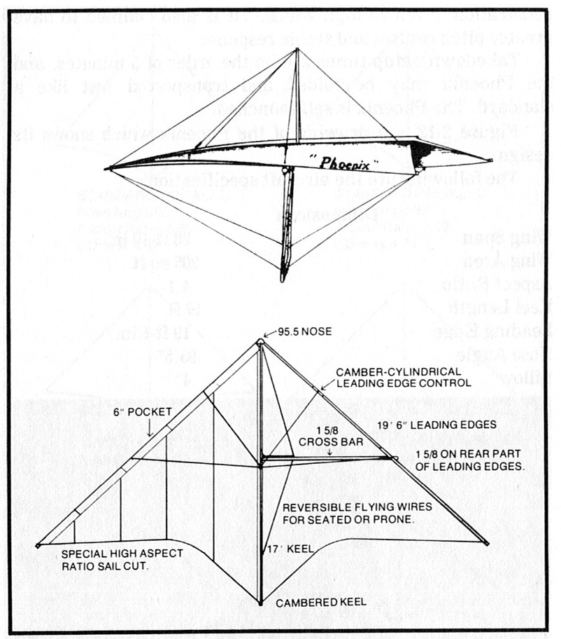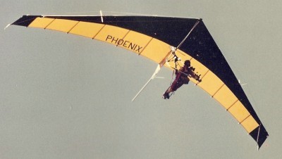 Designed by Dick Boone, the Phoenix is a medium aspect ratio Rogallo hybrid with a ‘fan tail’ sail cut, and cable tensed semi-cylindrical leading edges. It is controlled solely by means of weight shifting.