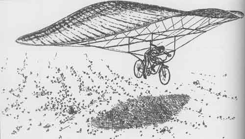 Dinelli and his “Aereoplano apparatus” weighed a combined total of 211 pounds and was controlled by a number of ropes pulled by the operator. The glider, constructed of steam-bent spruce covered with cotton fabric, apparently was attached to a bicycle. Dinelli seems to have garnered some construction advice from Frank Brown, an English clown with the Carlo Brothers Circus. The wing was arranged to tilt (in order to vary the angle of incidence) so Dinelli could choose when to gain lift. He pedaled the bicycle to gain speed and then tilted the wing to lift just as he left the edge of Garibaldi Hill, timed to take advantage of an updraft. Dinelli’s glide, apparently his last, ended with damage to his glider and bruises to himself.