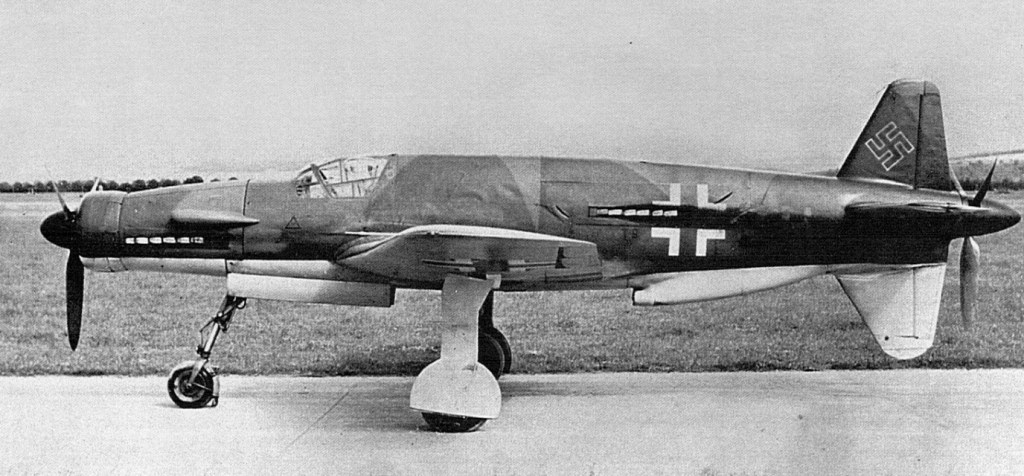 Powered by a pair of DB-603E liquid-cooled engines arranged in tandem, it has attained a speed in excess of 500 mph with both 12-foot, 3-blade propellers in operation. Operating on one engine, it can move along at a 350¬mph for several minutes.