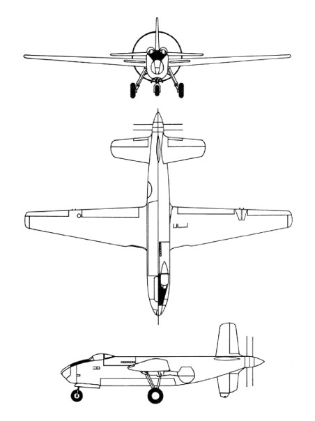The fuselage provided accommodation for a crew of three. A bomb-aimer/navigator in the nose, and the pilot and co-pilot in a side-by-side cockpit well forward on the fuselage, each beneath an individual canopy. The fuselage also incorporated an internal bomb bay, as well as housing the twin-engine powerplant in a compartment immediately to the rear of the pilot’s cockpit. The two Allison V-1710 engines were used to drive, via shafting and a reduction gearbox in the tailcone, two three-bladed contra-rotating pusher propellers to the rear of the tail unit. Opening the bomb doors in flight interrupted the airflow to the propeller and caused excessive vibrations. The bomber version had six machine guns. The four on the wing trailing edge were aimed by the copilot, whose seat could turn to face aft. An attack version armed with 16 machine guns or a 75mm cannon and two machine guns, or two 37mm cannon was proposed.
