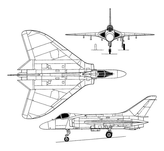 The F4D Skyray was a cantilever mid-wing monoplane, the wing of modified delta configuration incorporating elevons to serve collectively as elevators or differentially as ailerons. The tail unit had only swept vertical surfaces, landing gear was of retractable tricycle-type. The pilot was accommodated well forward of the wing.