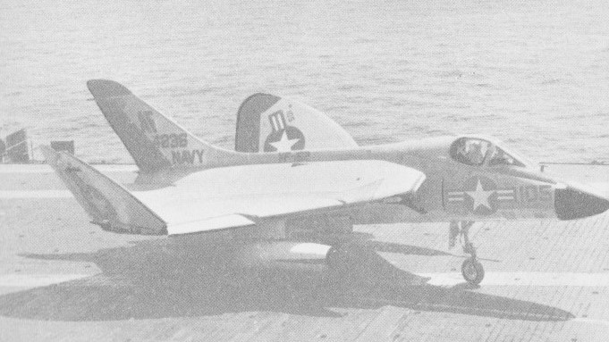 US Navy interest in German delta-wing research led, in 1947, to the design by Douglas of a carrier-based interceptor with a variation of the pure delta wing. Approval of the Douglas design was signified by the award of a contract for two Douglas XF4D-1 prototypes on 16 December 1948, the first making its maiden flight on 23 January 1951 powered by a 2268kg thrust Allison J35-A-17 engine. This represented an emergency powerplant, resulting from delays in development of the Westinghouse J40 turbojet which had been the planned engine. Both prototypes were flown subsequently with the XJ40-WE-6 developing 3175kg thrust and the XJ40-WE-8 which had a rating of 5262kg with afterburning, but problems with this engine programme led to final selection of the Pratt & Whitney J57 engine for production aircraft.