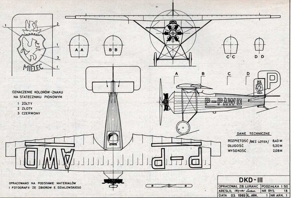 In the summer of 1927, Stanisław Działowski transformed the wrecked DKD-I plane into a single-seat DKD-III aircraft. With the help of his colleagues, Działowski made a new fuselage and chassis in the 2 Air Regiment workshops in Kraków, and renovated the batten, which came with the tail from DKD-I. From Aeronautics Department MSWojsk rented an Anzani engine.