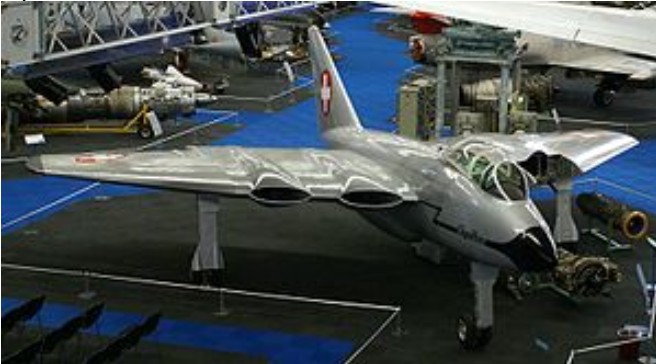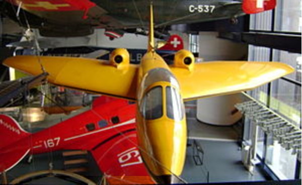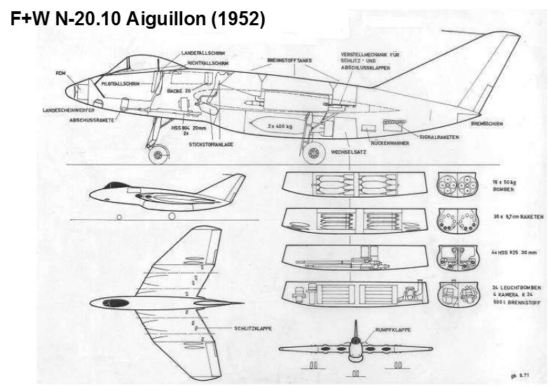 The EFW N-20 “Aiguillon” (English: Stinger) was Switzerland’s first jet fighter aircraft. The Swiss Federal Aircraft Factory developed a design for a four-engined swept winged fighter following the end of the Second World War. The aircraft was to be powered by four turbofan engines buried in the wings, with the bypass air feeding cold-air pipes each side of the engine, being routed through a combustion chamber where additional fuel could be burned as a form of reheat, or deflected though large slots on the upper and lower wings to act as aerodynamic flaps or thrust reversers. Two engines could be shut down in flight to increase range. It was planned that the N-20 would carry its armament in a detachable weapons bay, capable of carrying large loads of cannons, rockets or bombs.