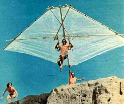 The wing is a version of the Bat-Glider with changes for sure. Taras Kiceniuk made a Batso version with a change from Bat-Glider (published plans by Jim Foreman….which themselves were developed from photos and notes given Foreman by Richard Miller of Millers’s earlier Bamboo Buttfly). Eipper’s Penninsula Hang Gliding crew made the bamboo and polyethelene glider to fly off the Torrance Beach sand cliffs in 1971. Materials used: bamboo canes, string, sillage bags type polyethylen sheets…